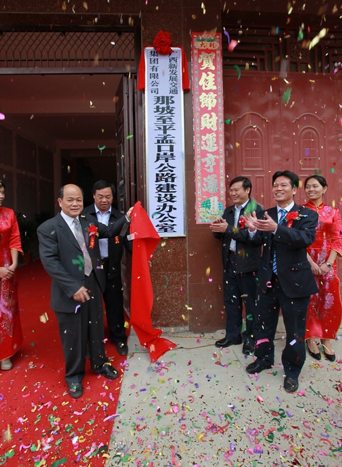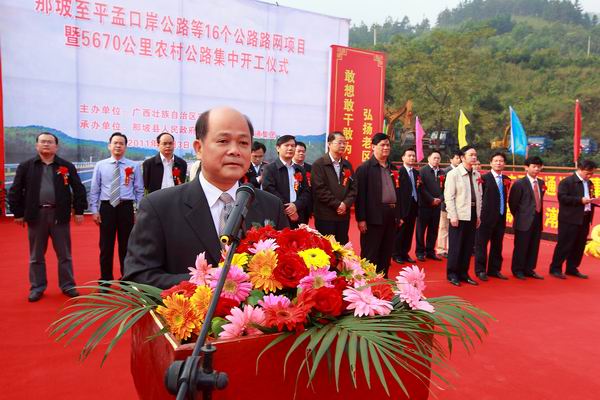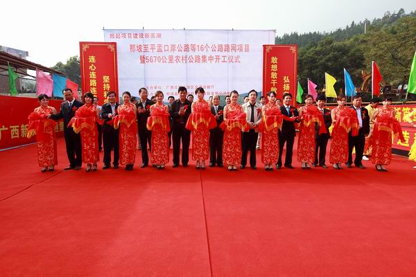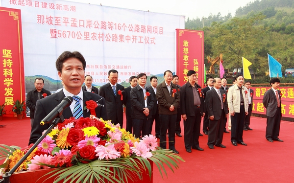 為貫徹落實(shí)自治區(qū)黨委、政府在全區(qū)掀起項(xiàng)目建設(shè)新高潮的決策部署,沖刺第四季度,完成全年公路建設(shè)目標(biāo)任務(wù),自治區(qū)交通運(yùn)輸廳于11月3日舉行全區(qū)公路路網(wǎng)改造項(xiàng)目集中開工儀式。由集團(tuán)公司承辦的分會(huì)場(chǎng)——那坡至平孟口岸公路等16個(gè)公路路網(wǎng)項(xiàng)目暨5670公里農(nóng)村公路集中開工儀式在百色市那坡縣德隆鄉(xiāng)隆重舉行。自治區(qū)交通運(yùn)輸廳紀(jì)檢組長(zhǎng)、廳黨組成員朱名勝,百色市市委常委、政法委書記周武紅,市人大常委會(huì)黨組成員黃五同,集團(tuán)公司黨委書記、董事長(zhǎng)朱堅(jiān)和、總經(jīng)理李定倫、黨委副書記張友坐、副總經(jīng)理劉明洪、總工程師覃炳賢,自治區(qū)公路管理局、百色市公路管理局、交通運(yùn)輸局、那坡縣四家班子、集團(tuán)公司直屬各單位領(lǐng)導(dǎo)及有關(guān)部門負(fù)責(zé)人等出席開工儀式。
