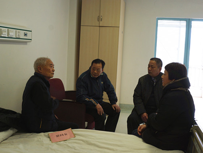 集團(tuán)公司黨委副書記、工會(huì)主席張友坐(右二),總工程師覃炳賢(左二)到醫(yī)院看望慰問患病住院的老同志。