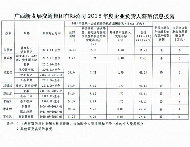 廣西新發(fā)展交通集團(tuán)有限公司2015年度企業(yè)負(fù)責(zé)人薪酬信息披露
