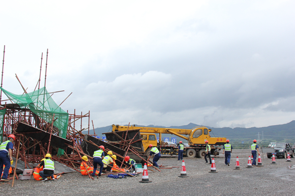 支架坍塌事故假想地點位于賀州至巴馬高速公路(鐘山至昭平段)新竹立交橋,假設(shè)工人在施工作業(yè)時,新竹立交橋支架突然坍塌,導(dǎo)致四名作業(yè)人員被困,其中一名被壓在鋼管下已昏迷,另一個工人手臂大量出血,其余兩個輕傷。