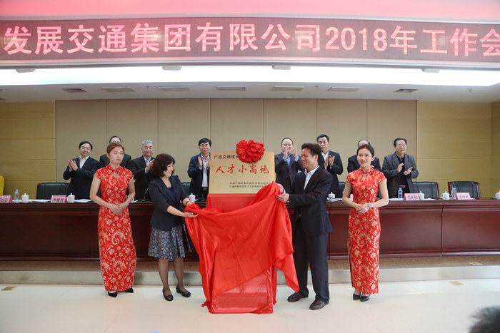 會(huì)后,自治區(qū)國資委副巡視員鞏學(xué)青與集團(tuán)公司黨委書記、董事長朱堅(jiān)和一同為集團(tuán)公司“廣西交通建設(shè)人才小高地”揭牌。