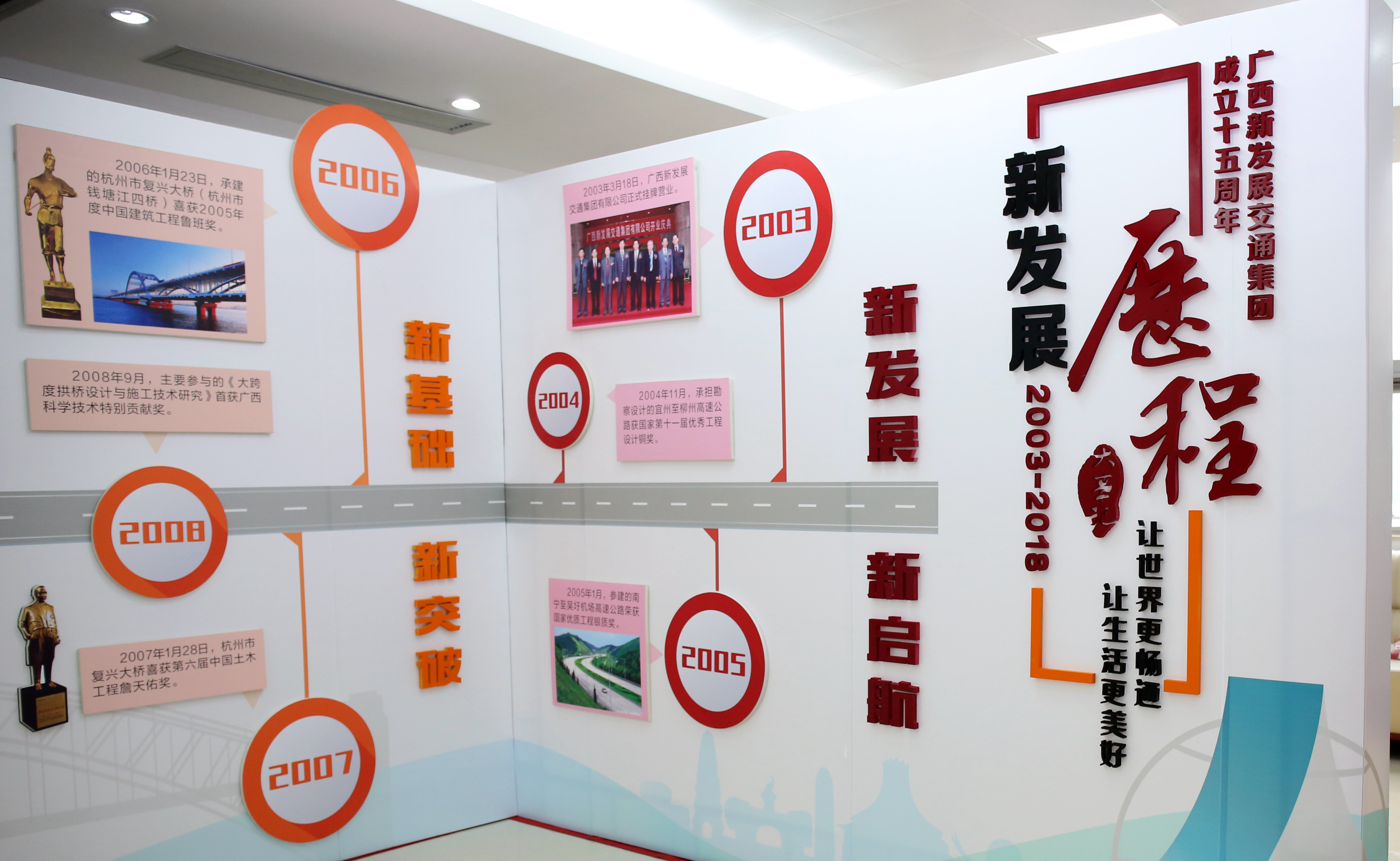 在活動(dòng)現(xiàn)場(chǎng)入口處,設(shè)置有一面企業(yè)發(fā)展歷程墻,展示了歷年來集團(tuán)公司發(fā)展取得的矚目成績(jī)?;顒?dòng)開始后首先播放了《新時(shí)代 新發(fā)展 新征程》——廣西新發(fā)展交通集團(tuán)15周年紀(jì)錄片,對(duì)15年發(fā)展史進(jìn)行了有聲有色的回顧。